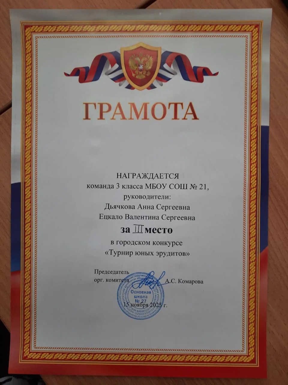 15 ноября ученики 3"Д" класса приняли участие в городском конкурсе "Турнир юных эрудитов", который состоялся в стенах школы N 27. Решали творческие задачи, разгадывали ребусы, показывали домашнее задание - сценку о дружбе. Обстановка была самая доброжелательная, способствующая раскрытию деткого потенциала. В результате наши ученики заняли III место! Поздравляем и желаем дальнейших успехов и побед!