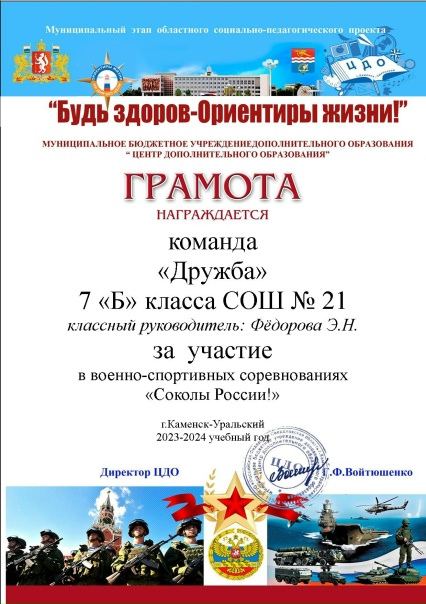 В течение 2023-2024 года учащиеся 7"Б" класса ( команда "ДРУЖБА") принимали участие в мероприятиях муниципального этапа областного социально-педагогического проекта "Будь здоров-ориентиры жизни!" Все конкурсы были интересными и достаточно сложными в подготовке: агитбригада "Великий и могучий русский язык", конкурс настольных игр о важных качествах человека 21 века, видеоролик "Из поколения в поколение" о ценностях и традициях семьи , спортивные соревнования "Папа, мама, я- спортивная семья!", военизированная игра "Соколы России", фотоотчет "Лыжня России 2024", "Живой дневник". Участвуя в проекте, класс стал дружнее, раскрылись новые таланты детей, многое узнали и многому научились, появился запал на новые и новые достижения. Эмоции были разные: радость общения, творчества, переживания побед и неудач, но сейчас осталось лишь все позитивное. Так динамично пролетел для нашего класса этот учебный год, кажется нам чего-то стало не хватать.... Итоги: мы стали призерами (2место) городского проекта и участниками областного полуфинала "Будь здоров!" ( 4 место). Несомненно это хорошие и важные достижения. Городская администрация сделала нам подарок: сертификат на 100000 рублей на туристическую поездку. Самыми активными участниками нашей команды в проекте были: Безбородова Милана, Вдовина Катя, Дегтярёва Полина, Захарищева Маша, Талашманова Настя, Евдокимова Кристина, Табанина Марина, Федоров Алексей. В трудных ситуациях нам помогали: семья Марии Захарищевой, семья Полины Дегтярёвой и семья Марины Табаниной и учителя: Ужакина Лариса Владимировна, Пешкова Елена Леонидовна, Вайнберг Наталья Владимировна, Сычёва Юлия Юрьевна, Нургалиев Дамир Сафаргалиевич. Наши достижения стали возможны благодаря дружному школьному коллективу.