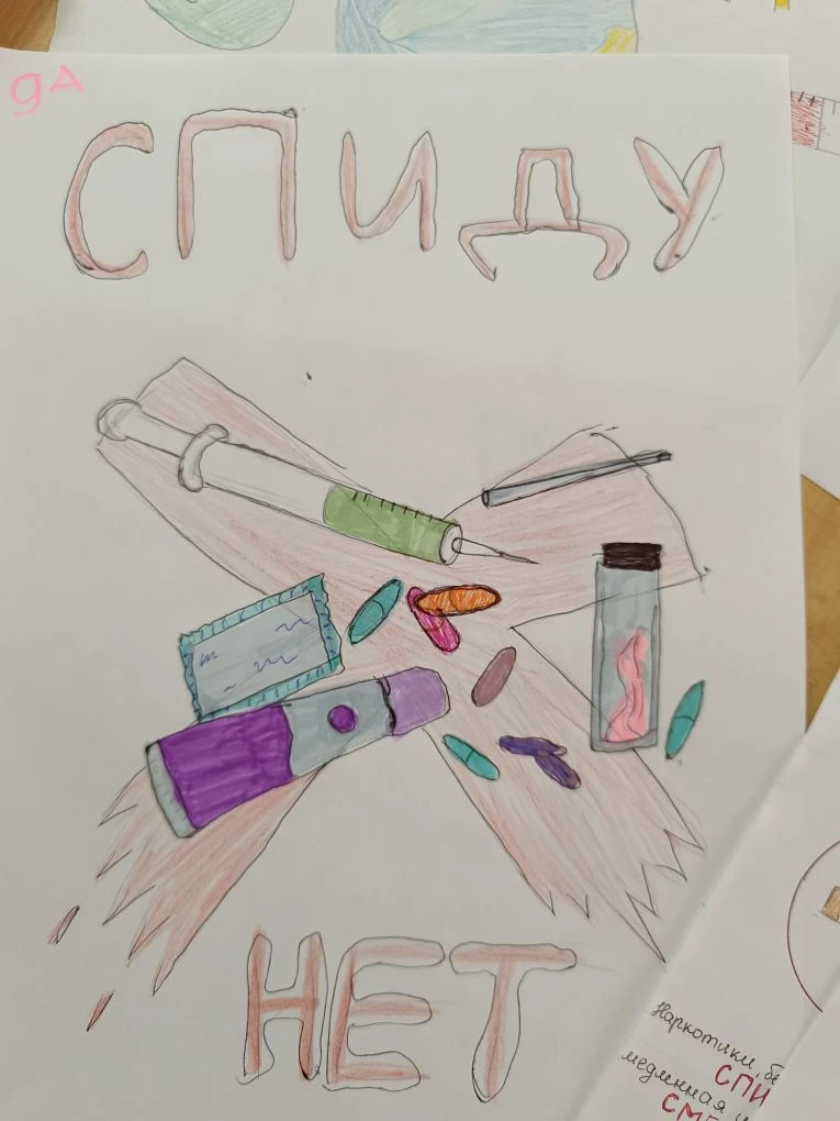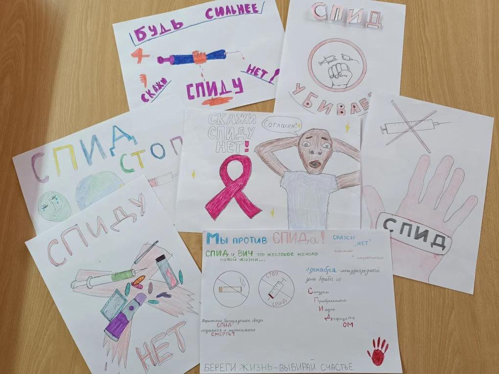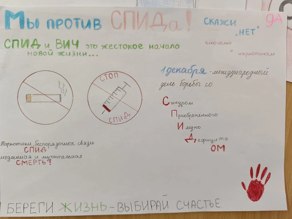 На уроке биологии учащиеся 9 «А» и 9 «Г» не остались в стороне: они с глубоким вниманием посмотрели видеоролики «Мифы и правда о ВИЧ», разобрали заблуждения, питавшие стигму, и — самое важное — выразили своё понимание темы в ярких, искренних плакатах. Каждый рисунок стал не просто заданием, а жестом солидарности, шагом к обществу, где знание побеждает страх, а сострадание — равнодушие.