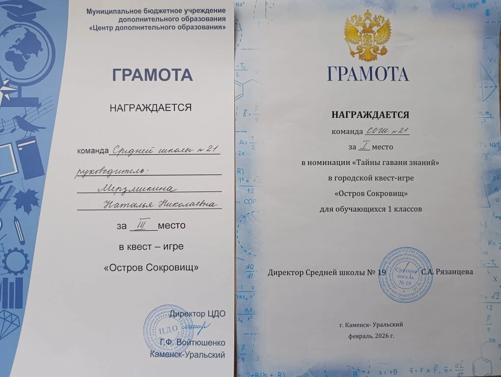 28 февраля в Средней школе № 19 состоялась городская интеллектуальная игра для первых классов - квест "Остров сокровищ". Ученики 1"А" класса: Ефремов Иван, Казаков Степан , Мореев Данил, Шугаева Василиса под руководством кл.руководителя Мерзликиной Натальи Николаевны готовились к состязанию в 4 конкурсных испытаниях, учились работать в команде. Старания команды увенчались успехом: команда заняла почетное 3 место! Также ребята стали лучшими в номинации "Тайны гавани знаний" - 1 место! Поздравляем команду с достойным результатом! Желаем новых открытий и побед!