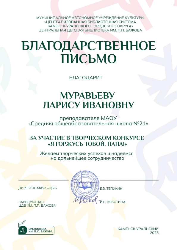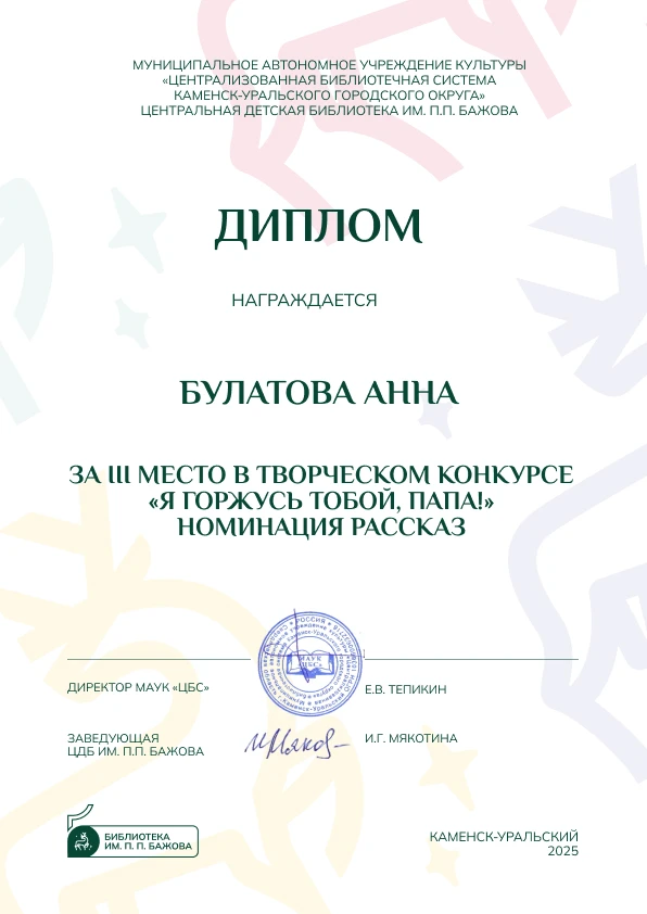 Со 2-3 декабря 2025 года в библиотеке П.П.Бажова были подведены итоги творческого конкурса "Я горжусь тобой,папа!" От нашей школы активное участие приняли учащиеся 5 "А" и 8"Б" классов(учитель Муравьева Л.И.).В номинации "Стихотворение" призером стала Чукреева Варвара (5"А" класс)!!!В номинации "Рассказ" - Булатова Анна(8 "Б"класс)!!!Участники конкурса: Брагина Надежда, Арапов Семён,Козлова Арина, Чукреева Елизавета!!! Поздравляем ребят и надеемся на дальнейшее сотрудничество!!!