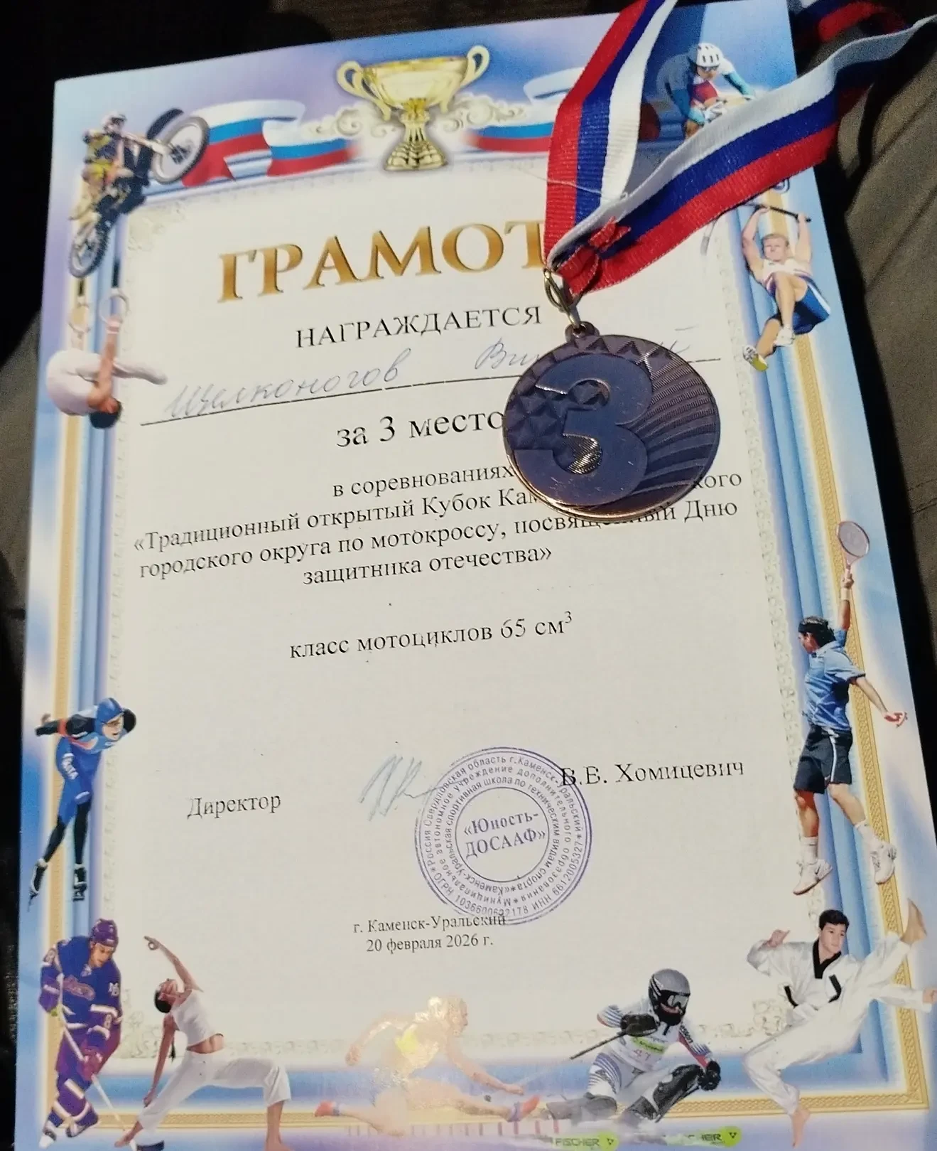 20 февраля в Каменске - Уральском проходили соревнования "Традиционный Кубок Каменск - Уральского городского округа по мотокроссу, посвященный Дню защитника отечества", Ученик 4 "В" класса Щелконогов Виталий успешно выступил на этих соревнованиях и занял 3 место в классе мотоциклов 65 см3. Поздравляем Виталия и желаем дальнейших побед и успехов!