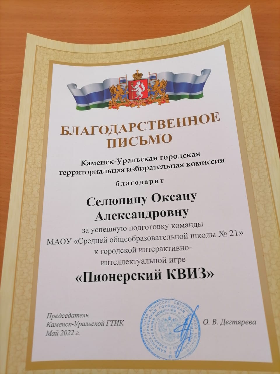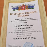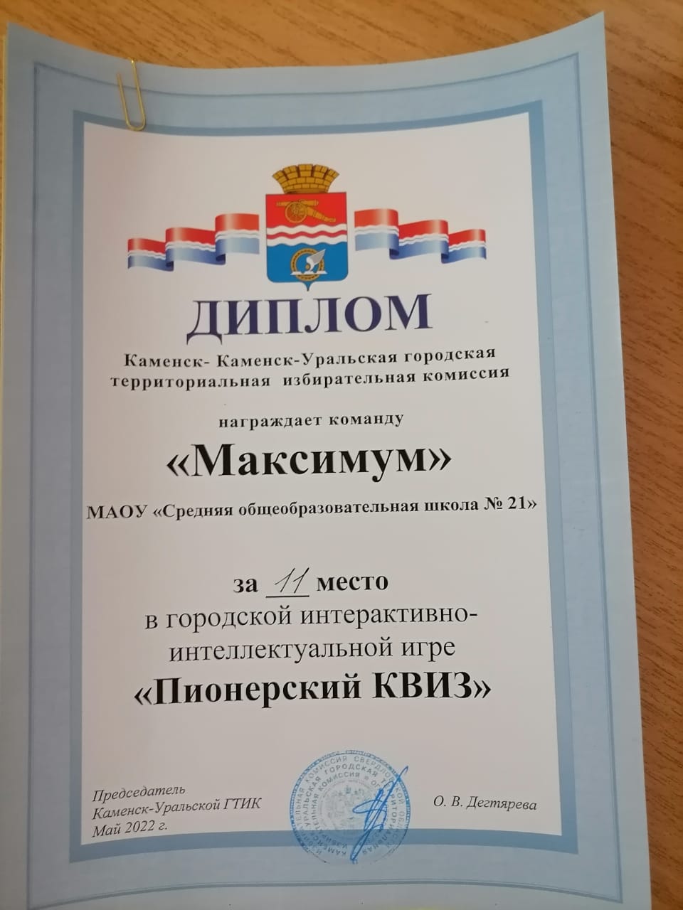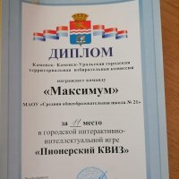 18 мая 2022 года прошла интерактивно-интеллектуальная игра "Пионер-всем ребятам пример".КВИЗ организовали и провели совместно Молодёжная Избирательная Комиссия, Центр Молодёжной политики и Каменск-Уральский ТерИзбирКом. Участвовало 15 команд школьников. Нашу школу представляла команда" Максимум" (8 "Б" класса), классный руководитель Селюнина Оксана Александровна.