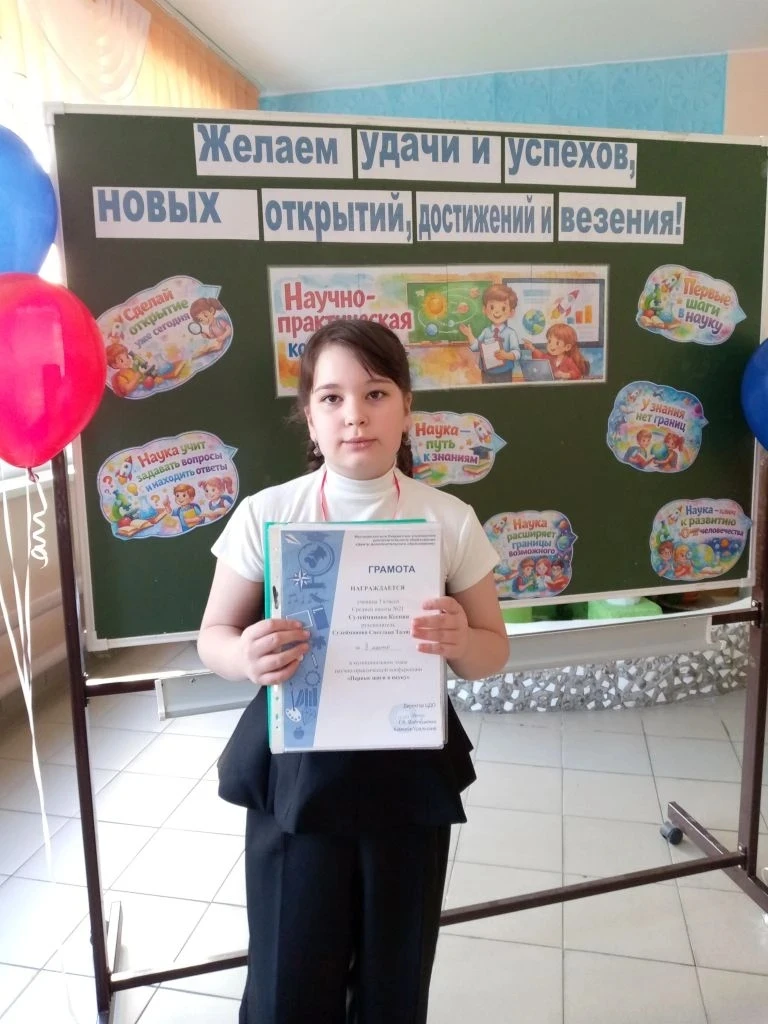 🏆Призер 2 места Сулейманова Ксения, 3"Г" класс. Она успешно защитила исследовательский проект "Может ли банановая кожура повысить калий в томатах?". Руководитель проекта Сулейманова Светлана Талиповна.