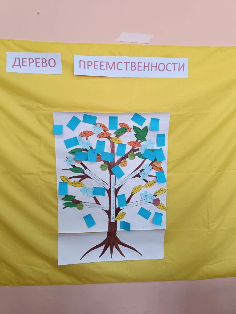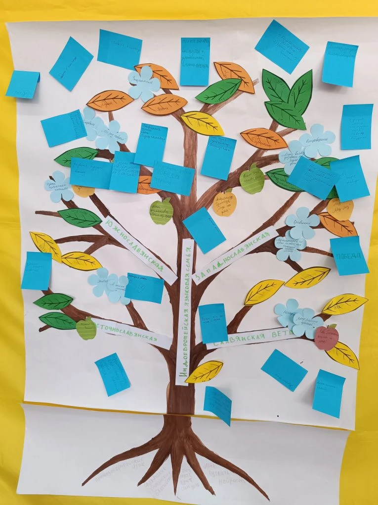 Главным итогом стало дерево на большом листе, которое собрали сами ученики. Корни — праязык, ствол с ветвями — родственные языки, листья — живые слова, цветы — средства выразительности, плоды — литературные произведения.