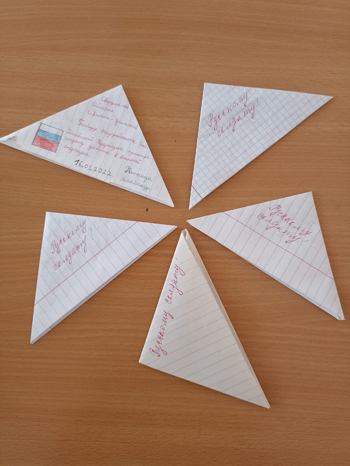 В нашей школе прошла акция "Напиши письмо солдату" с 15 по 17 марта. Участникам акции предлагалось написать бумажное письмо,в котором можно было рассказать о себе,своих мечтах, школьной жизни. А так же выразить слова благодарности и поддержки тем,кто сегодня, рискуя жизнью, обеспечивает мирное будущее нашей страны. В акции принимали участие все желающие ученики. Дети написали рукописное письмо со словами поддержки российских войск, участвующих в спецоперации в Украине. Письма солдату были оформлены в стилистике писем Великой Отечественной войны в виде солдатских треугольников.