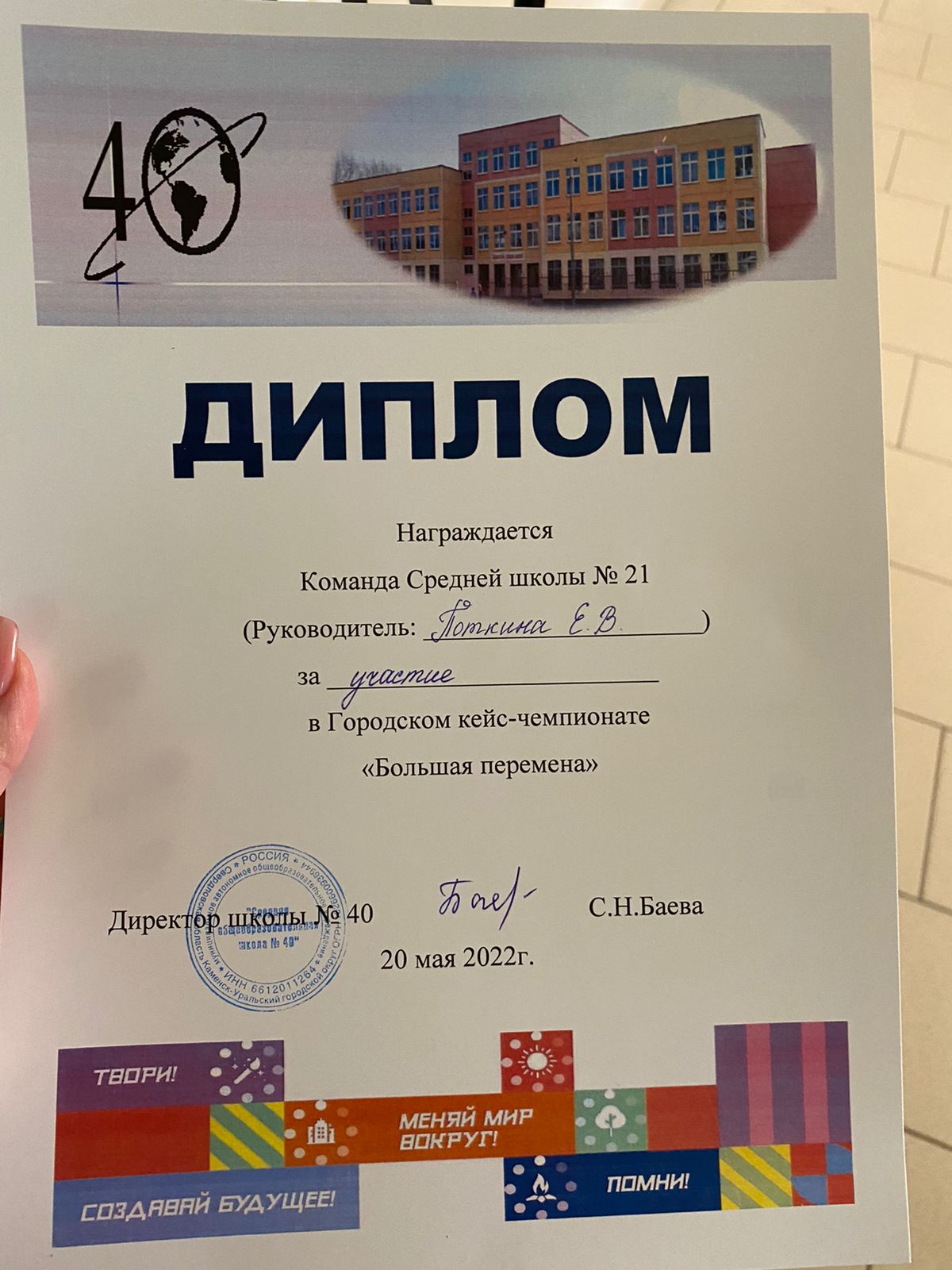 20 мая в Средней школе № 40 г. Каменск-Уральский впервые прошел городской кейс-чемпионат «Большая перемена», участие приняли 5 команд. Команду от Средней школы № 21 представили ребята 6 «Б» класса: Свидерский Никита, Дудочкин Матвей, Рысев Дмитрий, Комар Ксения и Казакова Полина под руководством классного руководителя Поткиной Е.В. Перед командой стояла не простая задача, решить кейс «Город-это бренд», для этого предстояло работать в коллективе, искать информацию, генерировать идеи и выбирать лучшую, дорабатывать её и обсуждать. Благодаря взаимопомощи, распределению обязанностей и креативности, группе удалось представить свой проект, а также получить новые навыки и огромный опыт, за который мы благодарим организаторов!