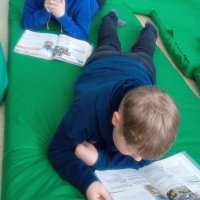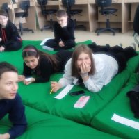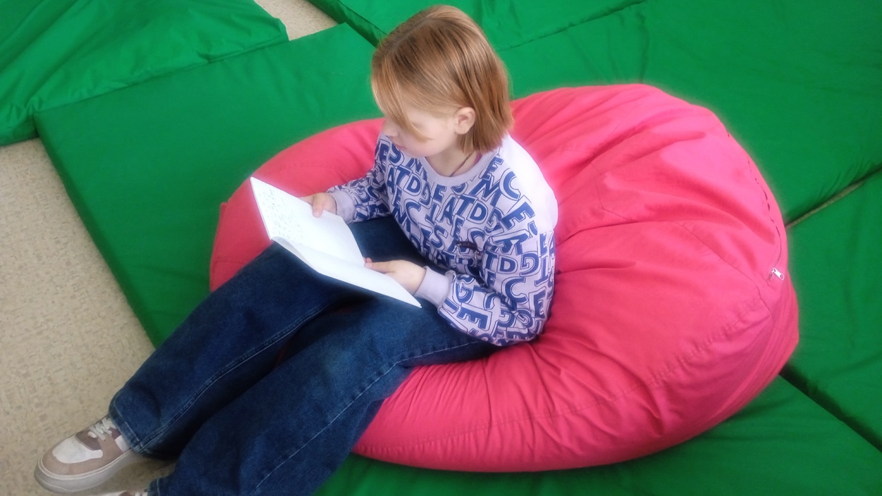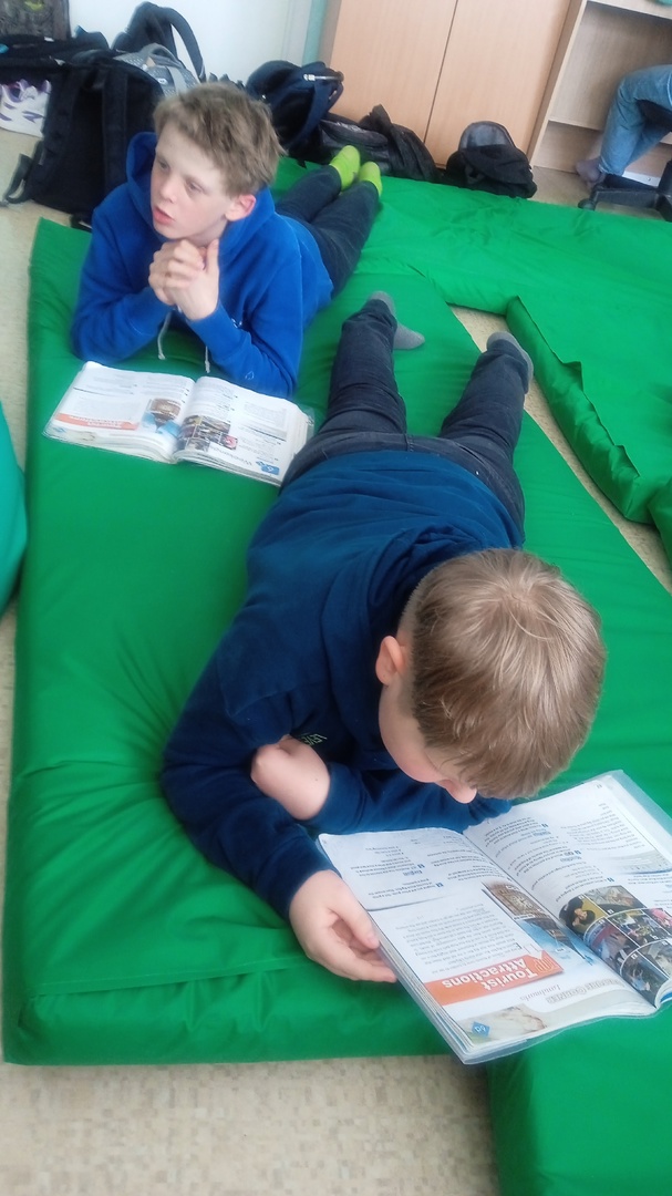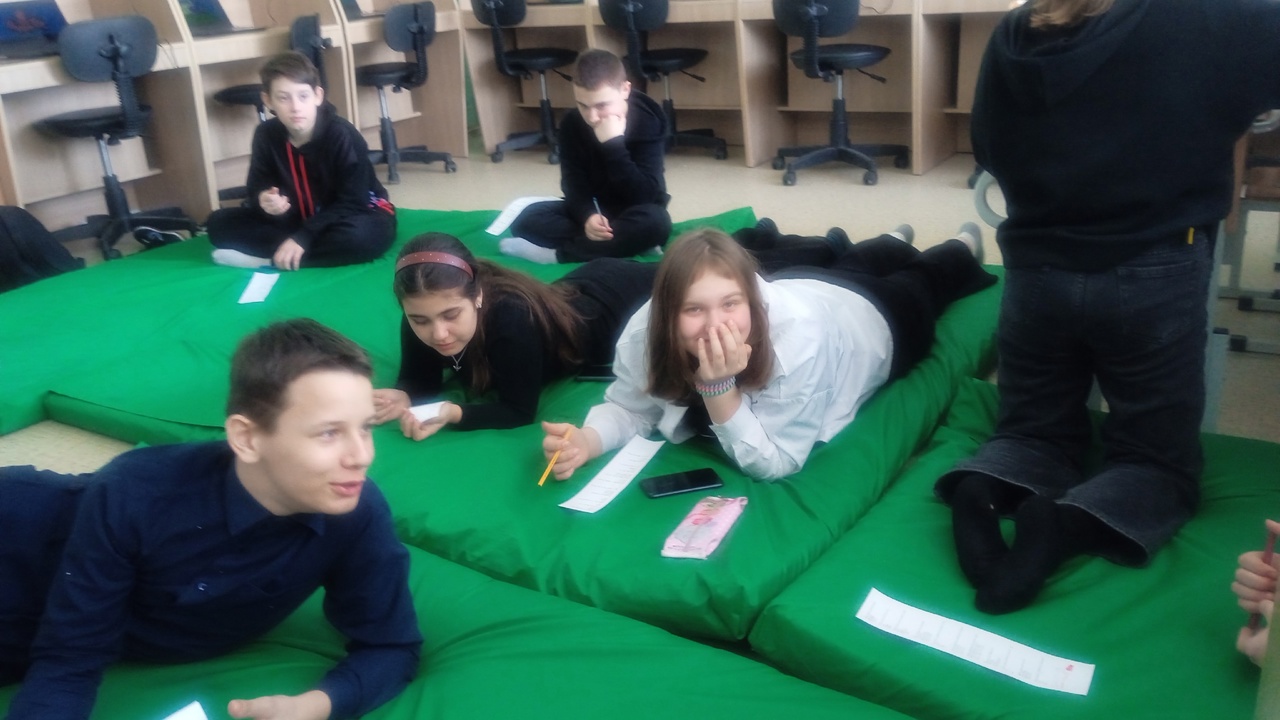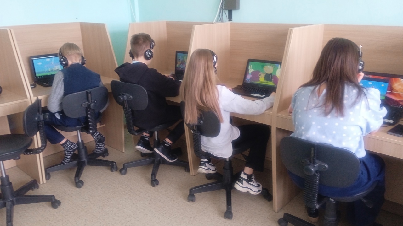 Ребята работали на ноутбуках, выполняя индивидуальные задания по просмотренному мультфильму. Делали упражнения в командах на интерактивной доске. Читали и пересказывали тексты, устроившись в уютных креслах или просто лёжа на матах.