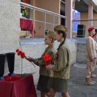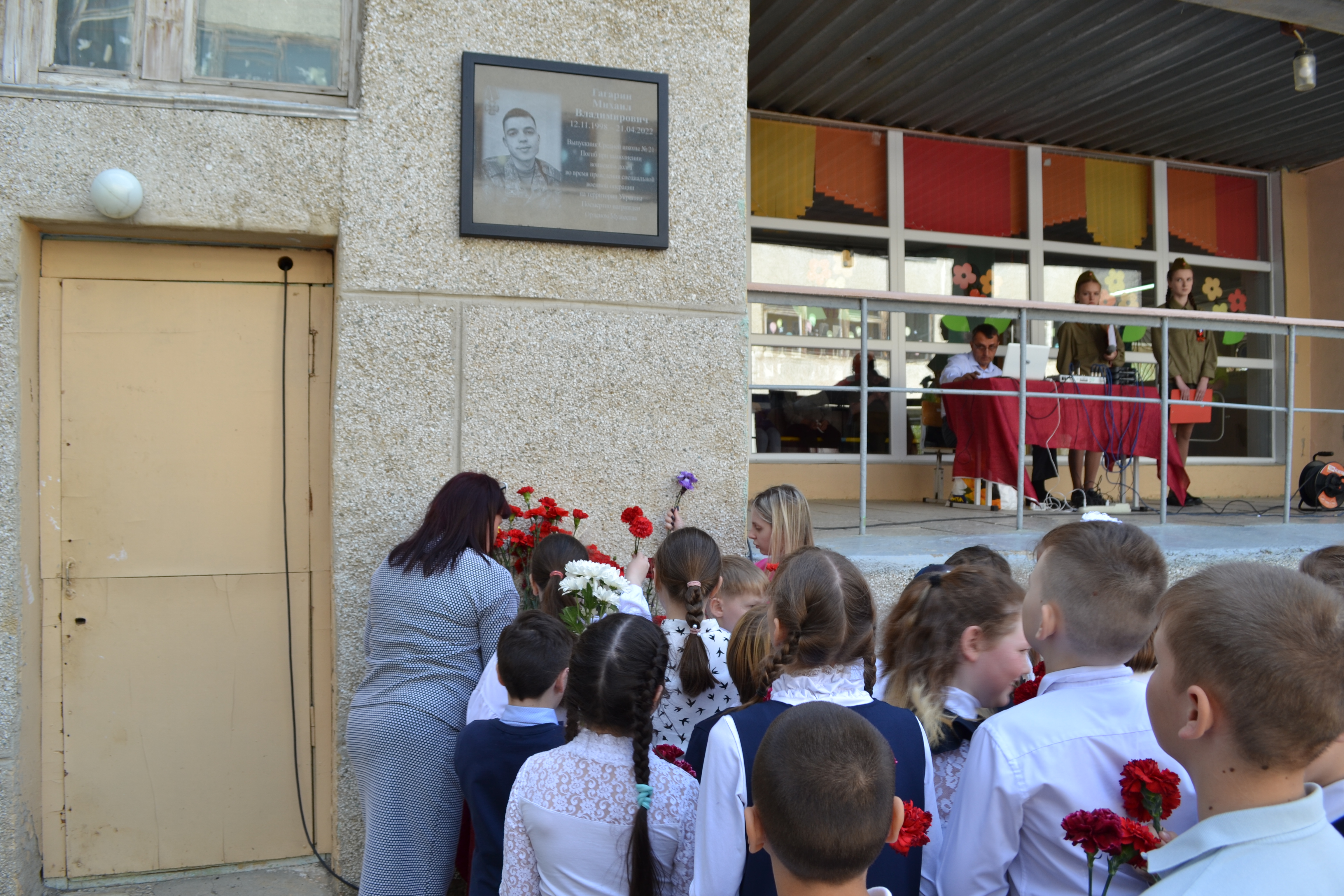 Память павших в борьбе с фашистскими захватичками, а также в память погибшего выпускника школы Гагарина Михаила Владимировича при исполнении воинского долга почтили минутой молчания. После чего прошло возложение цветов к мемориалу.