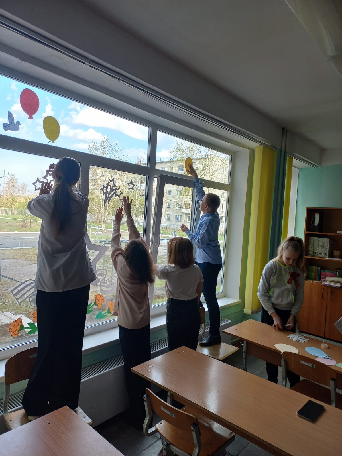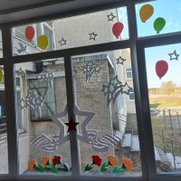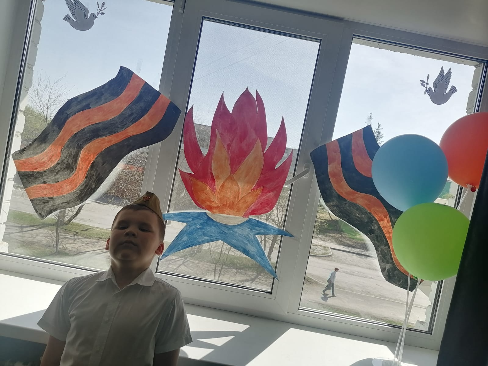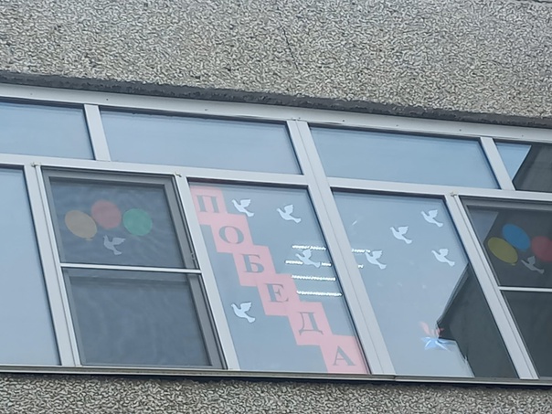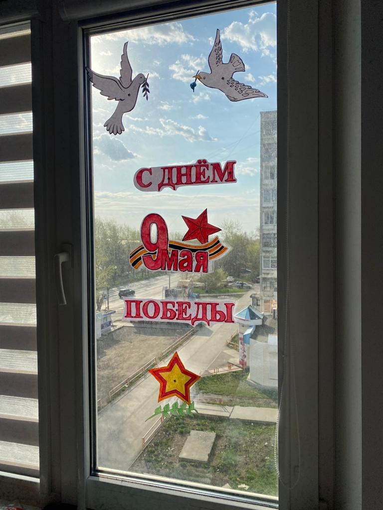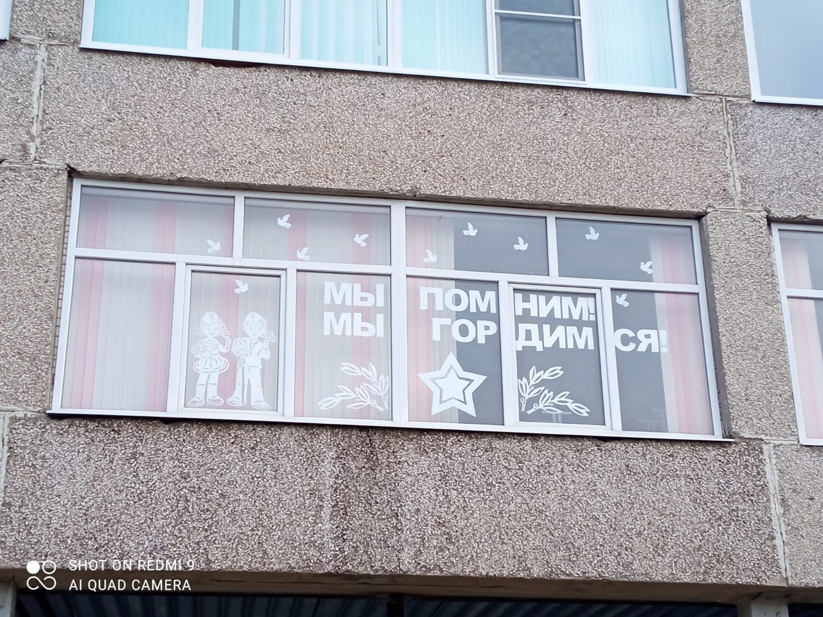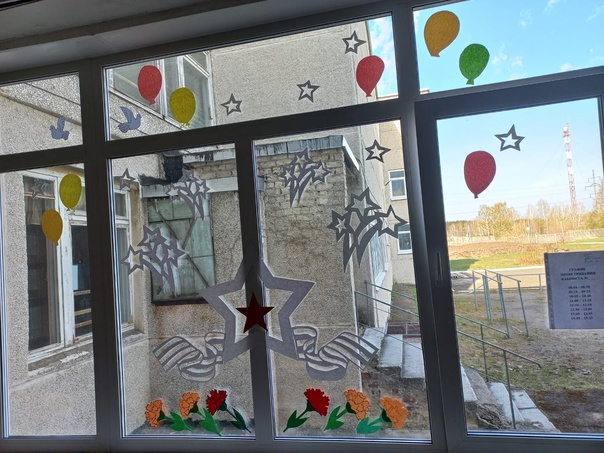 Участники акции оформили окна школы с помощью рисунков, картинок, надписей, посвященных Победе советского народа над фашизмом в Великой Отечественной войне. Учащиеся творчески подошли к оформлению окон, вырезали по трафаретам символы победы и праздника: голубей, воздушные шары, звёзды, салют.