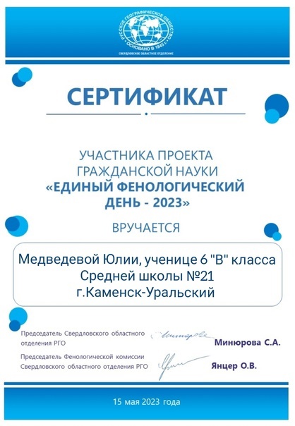 Акция проводилась Фенологической комиссией Свердловского областного отделения РГО. Каждый участник получил именной сертификат.